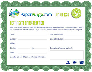 By purging outdated files or placing a locked security consoles in your office, PaperPurge.com will maintain and ensure your document disposal program that meets HIPAA shredding requirements. Our highly trained and certified security professionals efficiently shred all documents right on your premises. We give you the option to watch the shredding process, and you will be provided with a Certificate of Destruction that records each shred.